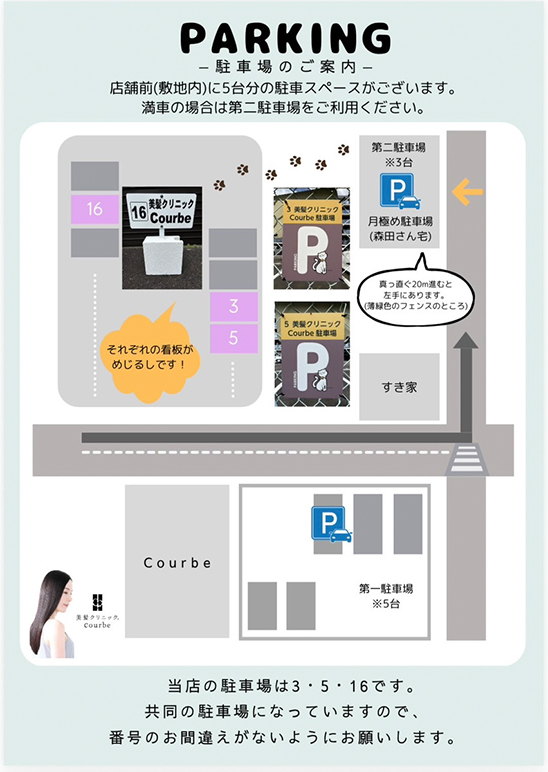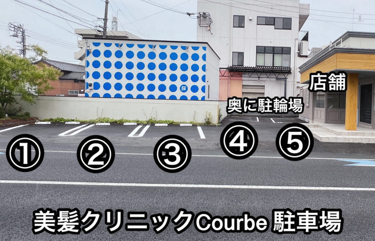 お店の横(敷地内)に駐車場5台、その奥に駐輪場がございます。写真をご参照ください。
