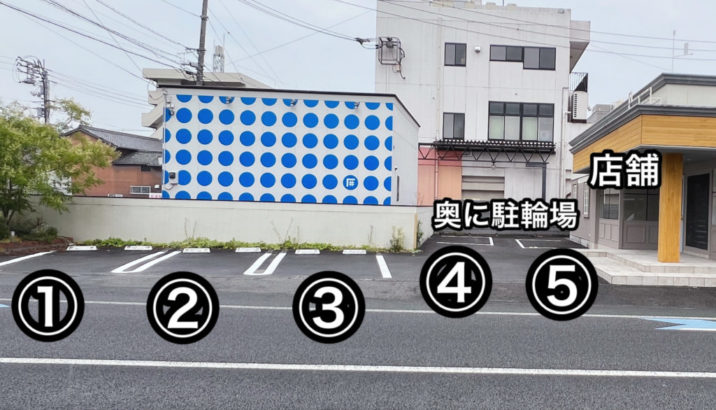 店舗前駐車場5台、その奥に駐輪場がございます。写真をご参照ください。④⑤は横に壁がありますのでご注意ください。