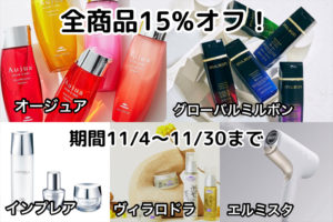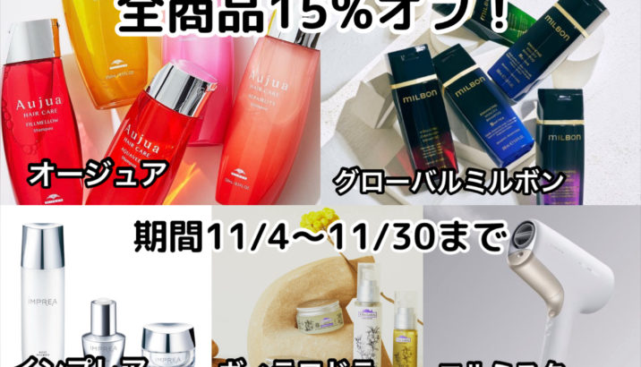 【11/4〜11/30までオージュア、グローバルミルボン、ヴィラロドラ、インプレア、エルミスタドライヤー、全商品15%オフ】